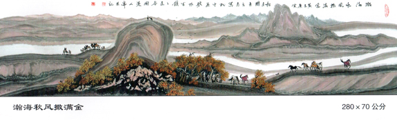 李宏泰先生的大漠风情国画,在表现大漠浩瀚如海的同时,无不表现出生命力的顽强,大漠中的红柳、胡杨树、野骆驼、牦牛、骏马、野鹿、奋飞的鸟、帐篷、牧民……顽强生存在大漠之中,尽管占画面的比例很小,但它们表现了极强的生命力。正因为有了这些生命力极强的东西,大漠才有了生气,才让我们感受到大漠的亲切。每当我看到李宏泰先生大漠风情国画中那一小簇红柳、几株胡杨树、几只野鹿、几匹骏马、一两个帐篷……我就不由自主赞美生命的顽强,赞美生命的美丽,我们还有什么理由不去热爱大自然,不去好好享受大自然给予我们的一切恩赐呢?