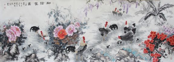 他多次被中央电视台、人民日报等国家级媒体誉为画鸡闻名。他的画无论是主体与构思、造型与色彩、构图与布景都有独到之处。这幅《和谐家园》作者在绘画风格上,在构图严谨布局中又用近乎平淡素雅的笔墨、色彩光艳的西画特特融汇相宜的创作手法,力求写实而不失写意精神、苍劲而不失洒脱俏逸,景物鲜活气韵生动的内在美感。观其整体画面,中心巨石之上一只雄鸡昂首高歌,周围几十只鸡禽各具姿态,在茂密的芭蕉紫藤、雍荣华贵的牡丹、浓郁的花荫草丛中悠闲恬静,它们或静止观望、或跳跃嬉戏、或悄然私语……。花草鸡禽相映成趣,充分展现了大自然旺盛的生命力和美好家园感人之魅力。更难能可贵的是,作者驾轻就熟地在四米多的画面中将五十六只公鸡、母鸡、大鸡、小鸡象舞台剧的导演调度一般将各个角色布局得巧妙得体,它们的疏密聚散、神态表情、内心世界的刻画,配景色彩的远近、浓淡,都处理得淋漓尽致、意蕴深邃,温馨可人。仿佛让人置身于春光明媚的环境之中,是那么的和谐幸福。