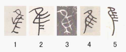 通过图5我们可以清晰的看到,“隹”(惟)字在不同时期所表现出的书写差异,其中1、2为甲骨文,3为商时期典型的字样,4为周早期字样,5为周晚期字样[5][6]。实际上笔者注意到,真正表现出明显象形特征的字符并不是刻划难度大些的甲骨文时期而恰恰是在土坯上书写最方便的金文时期。