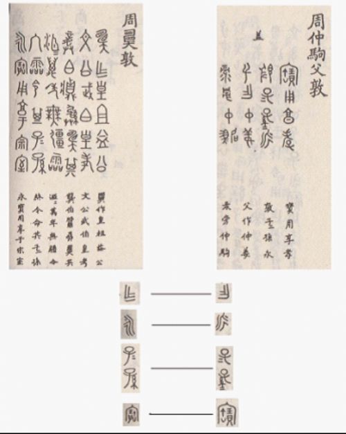 通过上面的图像对比,我们还可以看出金文还有一个被忽略的书写习惯是,早期的金文,排列上并没有明显的章法,同一个器物的器身和盖子上一般具有相同内容的文字,但是书写规范略有差异。早期字与字的排列没有明显的界限,西周和战国时期的金文则表现出字间距,行间距的规范。作为书写艺术的角度讲这具有本质的区别。