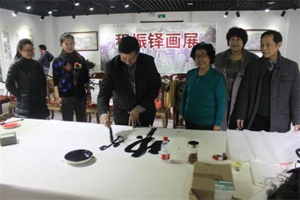 开幕式期间,程振铎老师带领嘉宾媒体参观展出作品并做了精彩讲解,随后,程老师又现场即兴创作了六尺整张山水《领吉引瑞》,获得阵阵掌声和叫好!