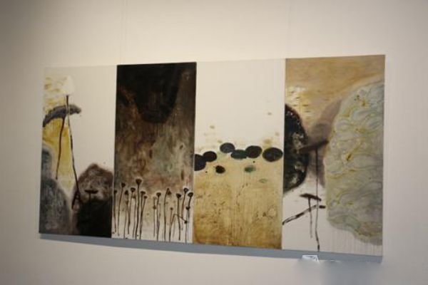 在展览现场看到一幅幅《荷风》,在语言形式上有抽象的元素,但从整体看仍是具象的绘画。齐白石先生曾说,好画要在似与不似之间,太似媚俗,太不似欺人。田崴在追求的就是这个点。他所创作的荷花,已经不是他眼中的荷花,而是他心里的荷花。