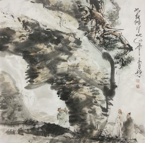 即兴的笔墨奔放、流走、凭着敏锐的感觉,迅刻立定主与次,繁与简、浓与淡、勾勒与泼墨、皱与擦、沉着与飞舞,人物与景致之间的诸多复杂关系,伴随着情感驾驭的笔墨,活脱于纸素之上。牵动的线条,笔痕墨迹,点画离披,起伏断连皆于常格相异,可谓笔不周而意周。文人的雅士之风,或聚或散,或立于松下,或坐于溪边,有意加强外轮廓笔线的力度和量感,服从于整体关系的需要。在笔墨情韵之中,隐含着生拙苦涩之味,令人咀嚼再三。