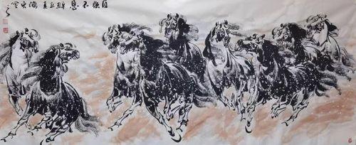 对于画马,陈宏有一套自我的量化技法,对于水墨比例、宣纸夹角、结构用笔他都有一套独特的量定。一匹匹动态骏马、无一重复、形态各异、呼之欲出。心中万马过,下笔如有神。陈宏说:“我不仅是在画马,这些马也是对我心情、情绪的一种宣泄。”